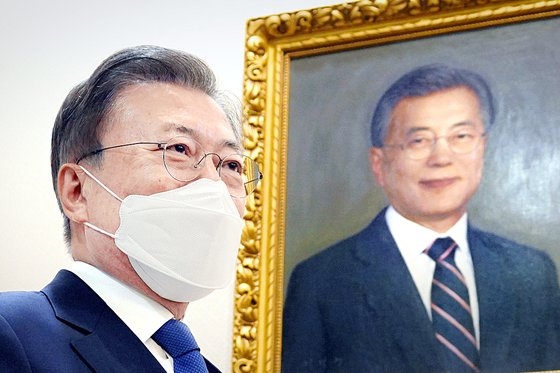 韓国の文在寅(ムン・ジェイン)大統領が今月3日、青瓦台(チョンワデ、大統領府)本館で開かれた任期最後の国務会議で本人の公式肖像画を紹介している。[写真 青瓦台]