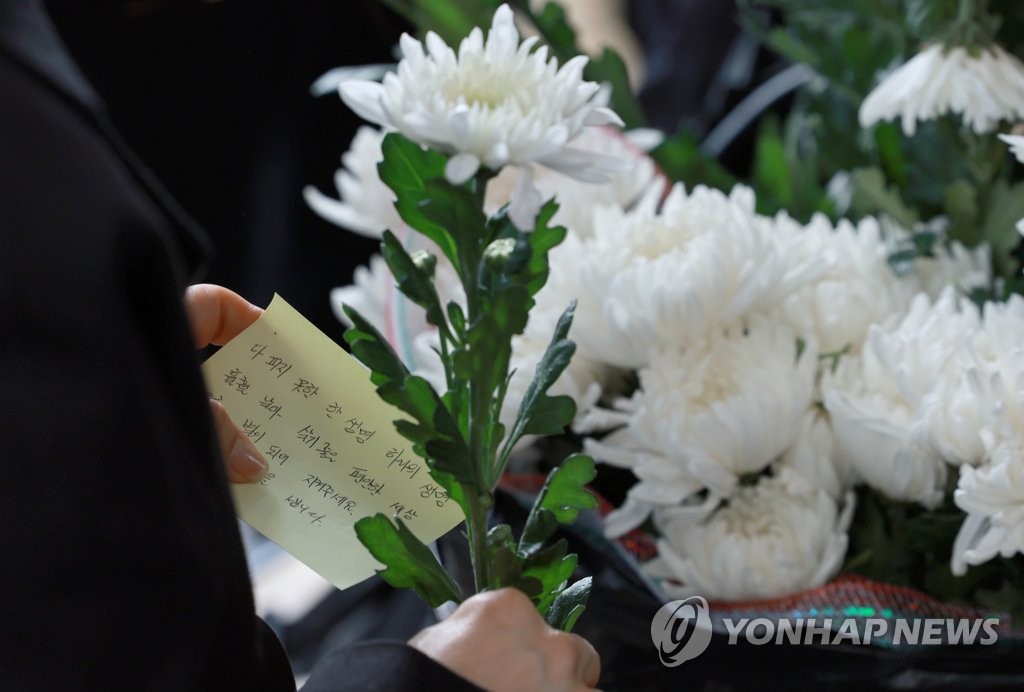 事故現場の近くに設けられた焼香所で献花する市民=1日、ソウル(聯合ニュース)