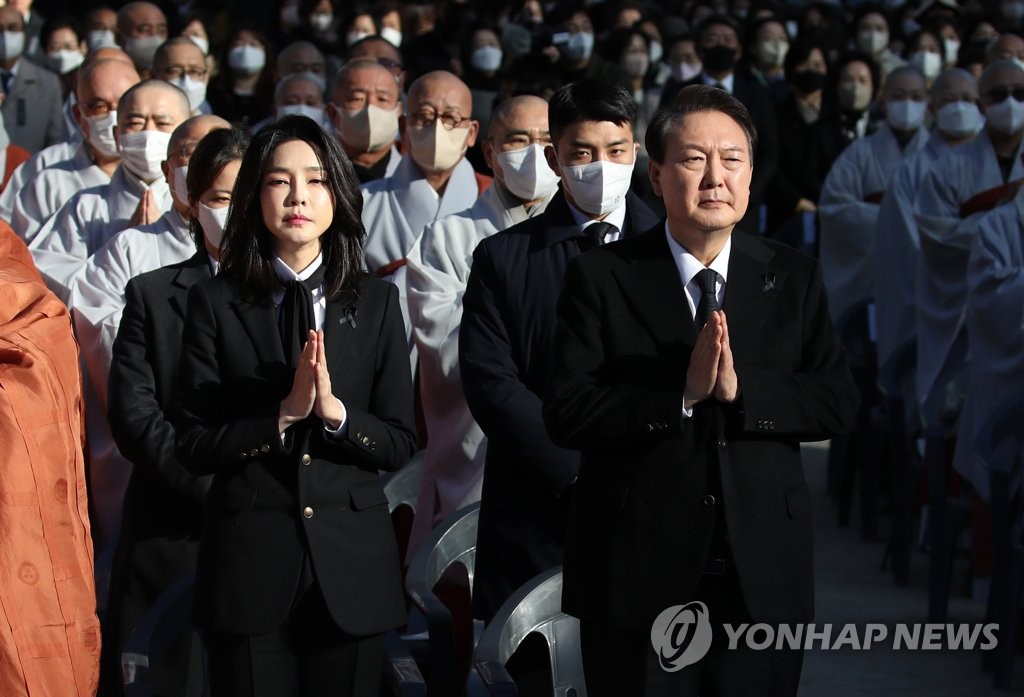 梨泰院雑踏事故の追悼法要に出席した尹大統領(右)と金建希(キム・ゴンヒ)夫人(大統領室通信写真記者団)=4日、ソウル(聯合ニュース)
