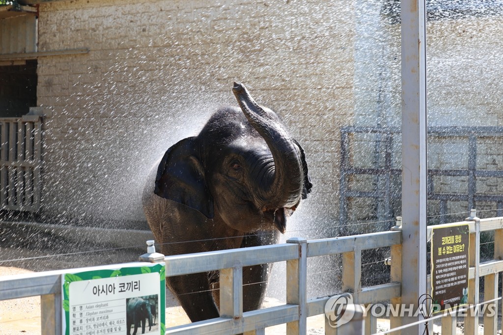 水浴びで涼を取る動物園のゾウ=3日、光州(聯合ニュース)