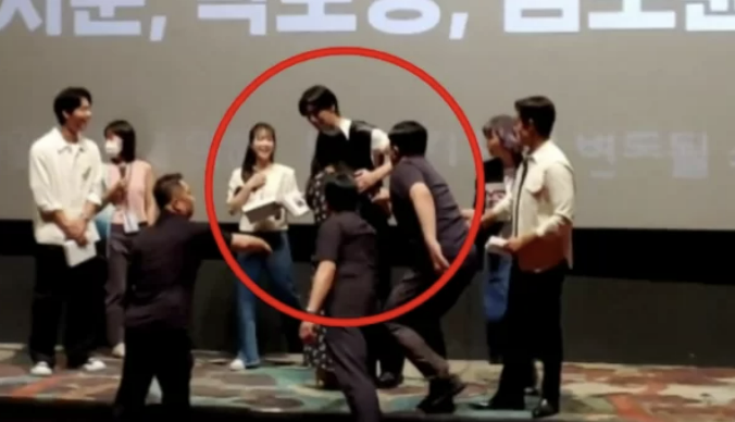 俳優パク・ソジュンが映画『コンクリートユートピア』(原題)の舞台挨拶の途中でステージに乱入した観客にひどい目に遭った。