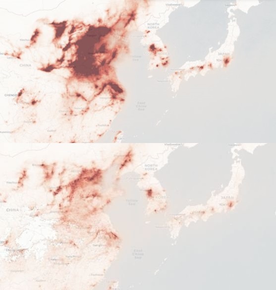 中国内の大気汚染度が増したことも韓国内の空気質に悪影響を及ぼす。欧州宇宙機関(ESA)が地球観測プログラム「コペルニクス計画」の衛星「センチネル」で中国の二酸化窒素濃度を分析した結果、最近2週間の平均濃度が1カ月前よりも顕著に急増した。特に、北京など韓半島(朝鮮半島)に隣接した中国北部地域が高濃度を意味する赤の領域で覆われた。粒子状物質を誘発する主犯の一つである二酸化窒素は心血管系疾患などを誘発する致命的な大気汚染物質に挙げられる。