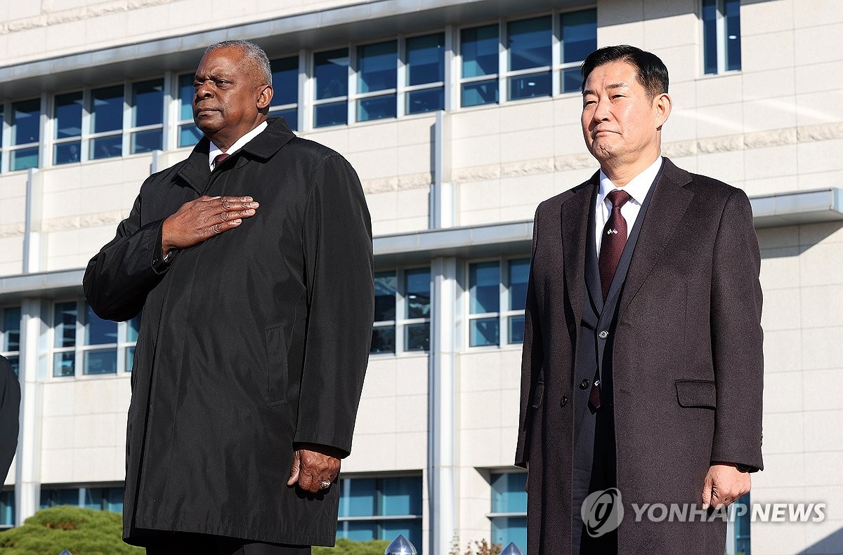 韓米定例安保協議(SCM)前のセレモニーに臨む申長官(右)とオースティン長官(写真共同取材団)=13日、ソウル(聯合ニュース)