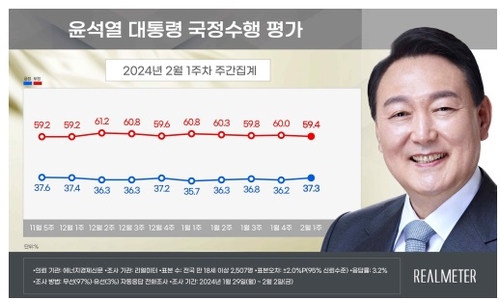 【ソウル聯合ニュース】韓国世論調査会社のリアルメーターが5日に発表した世論調査の結果によると、尹錫悦(ユン・ソクヨル)大統領の支持率は前回調査(先月22~26日)より1.1ポイント上昇した37.3%だった。調査は先月29日から今月2日まで全国の18歳以上の2507人を対象に行われた。