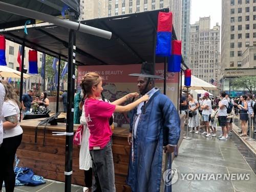 2023年7月19~22日、米ニューヨークで行われた「K観光ロードショー」で韓服(韓国伝統衣装)を体験する来場客(文化体育観光部提供)=(聯合ニュース)≪転載・転用禁止≫