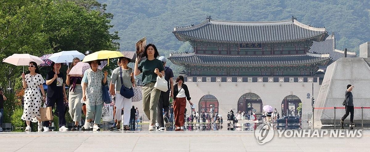 各地で猛暑となった19日、ソウルの光化門前の道路では「かげろう」現象が見られた=19日、ソウル(聯合ニュース)