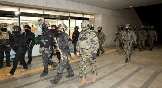 4日、軍当局によると、前日(3日)午後11時の非常戒厳宣言後、陸軍特殊戦司令部(特戦司令部)隷下の第1空輸特戦旅団・第707特殊任務団、首都防衛司令部第35特殊任務大隊などで構成された戒厳軍が国会に投入された。この部隊は陸軍の最精鋭戦力と評価されている。彼らの優先任務は「国会と政党の政治活動を禁じる」という戒厳司令部布告文第1番により国会議員と党役員などの国会出入りを防ぐことだった。