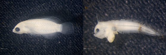 熱帯魚種稚魚2種(左、スズキ目・Symphurus leucochilus)とワニトカゲギス目