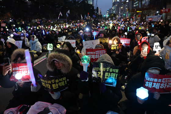 大学生も連日、弾劾賛成の声を出した。この日午後、ソウル新村(シンチョン)延世路一帯では「尹錫悦大統領不法戒厳糾弾および退陣要求のための全国大学生総決起集会」が開かれた。非常戒厳対応のための全国大学総学生会共同行動と全国20余り大学総学生会が共に主催した行事だ。主催側と警察などによると、約4500人が参加した。