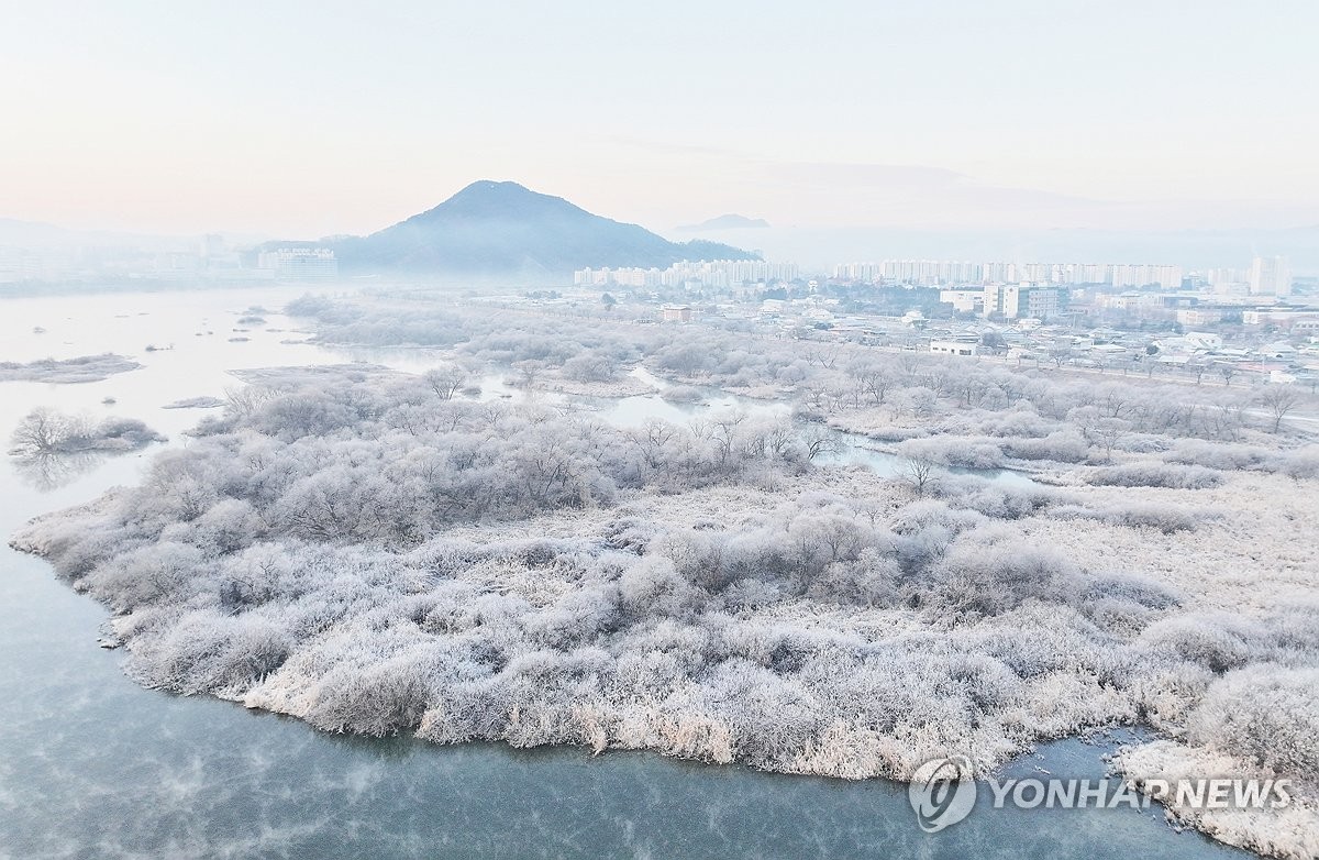 北東部・江原道の昭陽江の川辺が樹氷に覆われている=17日、春川(聯合ニュース)