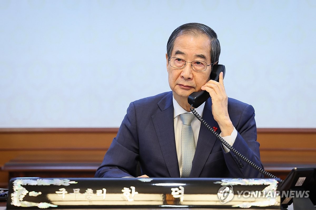石破首相と電話で協議する韓国の韓悳洙首相(首相室提供)=(聯合ニュース)≪転載・転用禁止≫