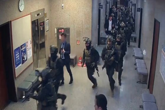 国会事務局が5日、戒厳令宣言(3日夜)後に国会議事堂に進入した戒厳軍の作戦状況が入った映像を公開した。写真は戒厳軍が国会職員の阻止を突破して国会議事堂2階の廊下に入る場面。 [写真 国会事務局]