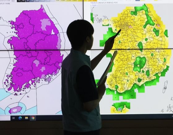 連日猛暑が続く中、27日、京畿道水原(キョンギド・スウォン)の首都圏気象庁で予報官が猛暑特報の状況(左)と気温を説明している。[写真 聯合ニュース]