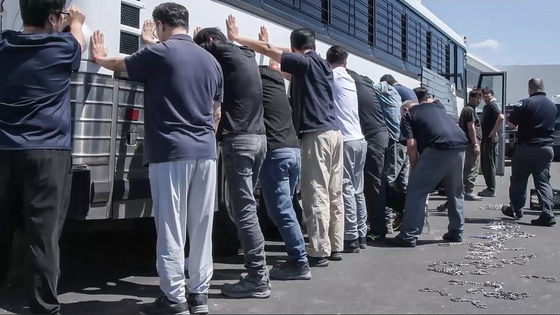 米国移民・関税執行局(ICE)や国土安全保障調査部(HSI)など所属の要員らが、今月4日(現地時間)、現代自動車とLGエナジーソリューションがジョージア州サバンナに共同建設中のバッテリー工場で、現場職員の体と足を手錠や鎖でつないでいる様子。[写真 ICE動画 キャプチャー]