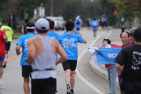 韓国の開天節(建国記念日)である10月3日、江原道春川市南山面(カンウォンド・チュンチョンシ・ナムサンミョン)一帯で開かれた「2025春川連合マラソン」で、参加者たちが住民の声援を受けながら走っている。[写真 聯合ニュース]