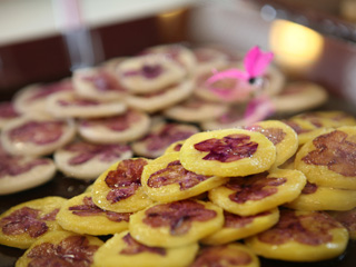 季節の花カラムラサキツツジをあしらった花餅(ファジョン)は、米粉を使用した優しい味の韓国伝統のお餅です。一般家庭やお花見で食べられることが多く、韓国の春を目で楽しみ、舌で味わえます。