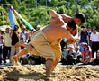 韓国の端午にはつきもの、民俗競技としての相撲(シルム)をとってるんです。今日の大一番観たさにソウル場所も大入りでござ〜い。