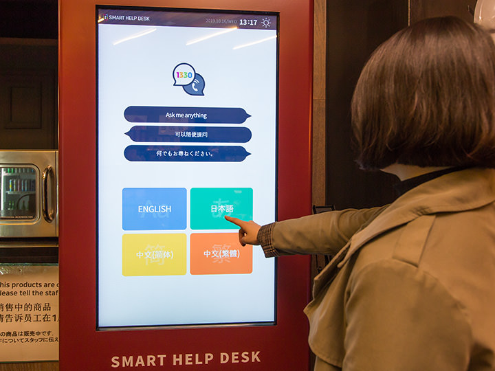 観光案内所の営業時間外にも利用できるように銀行ATMやコンビニに設置されているのが特徴。タッチパネルは日本語、英語、中国語に対応しています。