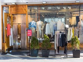 ショーウィンドウには花柄のワンピースや薄手のブラウスなど、春を先取りするコーディネートが並びます。