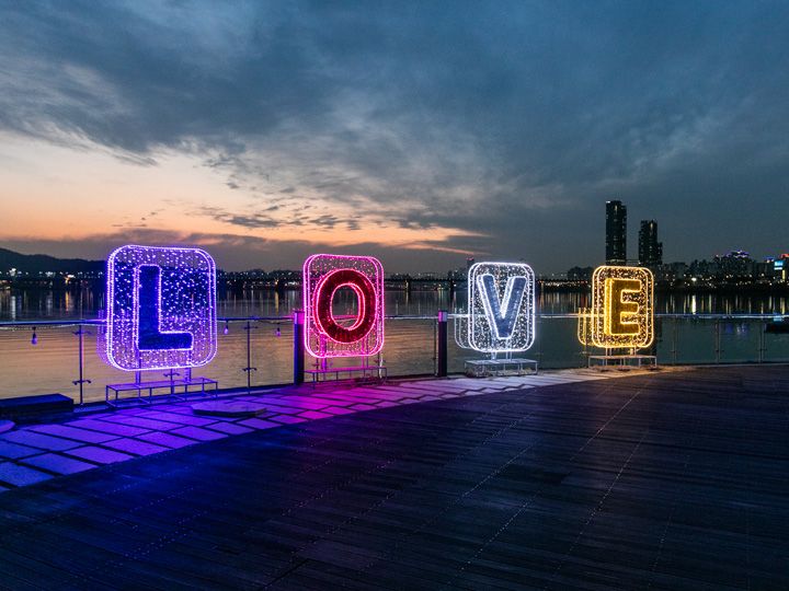 漢江をバックにした「LOVE」のイルミネーション。漢江と夕焼け空が見られる日没時が幻想的です。