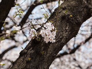 遊歩道には入れませんが、一般道から桜を眺めることはできるので、通行中の人々もしばし足を止めて桜に見入っています。