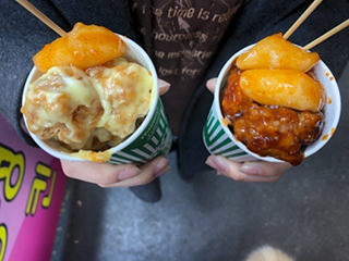 暑い日は、冷たいドリンクを片手に。トッポッキ、おでん、ティギムなどの定番屋台グルメを前につい足を止めてしまいます。