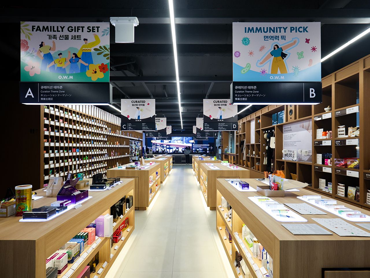 「身体と心をいたわる空間」を提供することをコンセプトとした2フロアの大型薬局。壁一面に薬がずらっと並べられた様子は、まるで美術館のようです。豊富な肌ケアアイテムはもちろん、小分けのサプリを好きな組み合わせで作れる独自のサービス(10日分1,000ウォン~)も。