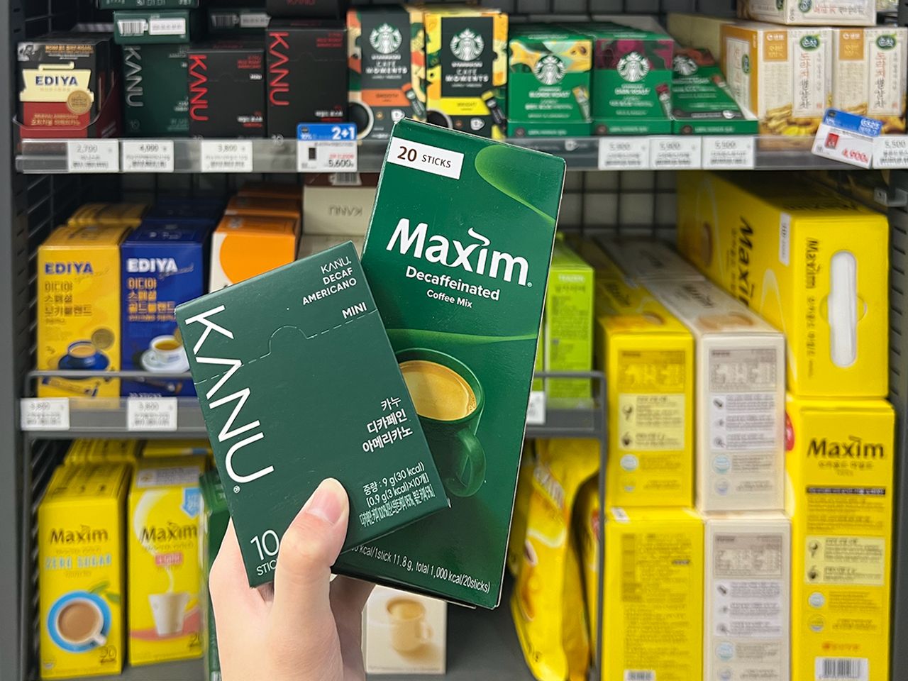 韓国のスティックコーヒーシェア圧倒的1位の「Maxim」。韓国ならではの甘いミックスコーヒーのデカフェ版を探しているならこれ。