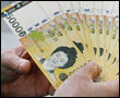 両替の限度は1人20枚まで、金額にすると100万ウォン。わあ、ずいぶん両替しましたね。ぴかぴかの新札を前にお父さんも満足そうです。