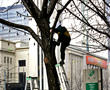 光化門(クァンファムン)での光景。通りの並木によじ登るおじさんたち。