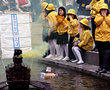 先ほどの亀甲船は、2メートルもする大型の模型。続いて行なわれたのは、小学生が自ら作った亀甲船を浮かべて、流れる速さを競う「亀甲船競技大会」。ゴールを目指して、いざ出陣!