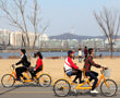 川沿いの漢江市民公園などに巡らされた自転車道路を走行。うららかな天気の下、快く風を切って、文字通り快走できます。特に2人乗りはいっそう心地良さそう。