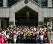 花束を沢山持って卒業を実感する語学堂の学生達。