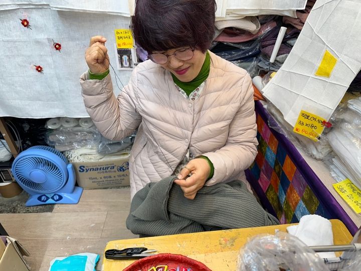 ソウルに着いたばかりだったのですが、セーターの袖口がほつれて困ってしまい、針と糸を売っているところがないか聞いたところ、針と糸なんてウチにたくさんあるからと、その場で縫って下さいました!