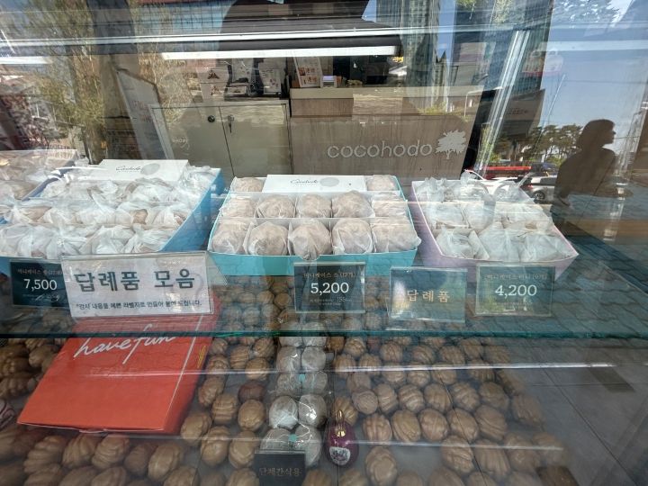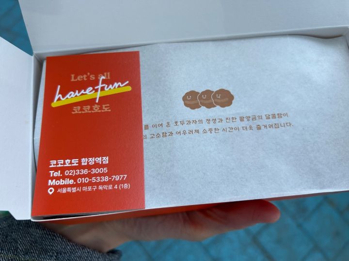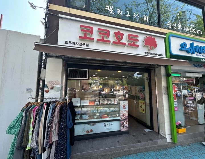 地下鉄6号線「合井」駅7番出口のすぐ前に「코코호도(ココホド)」という看板を出した小さなお店があります。全国チェーンのホドゥクァジャ(くるみ菓子)店です。