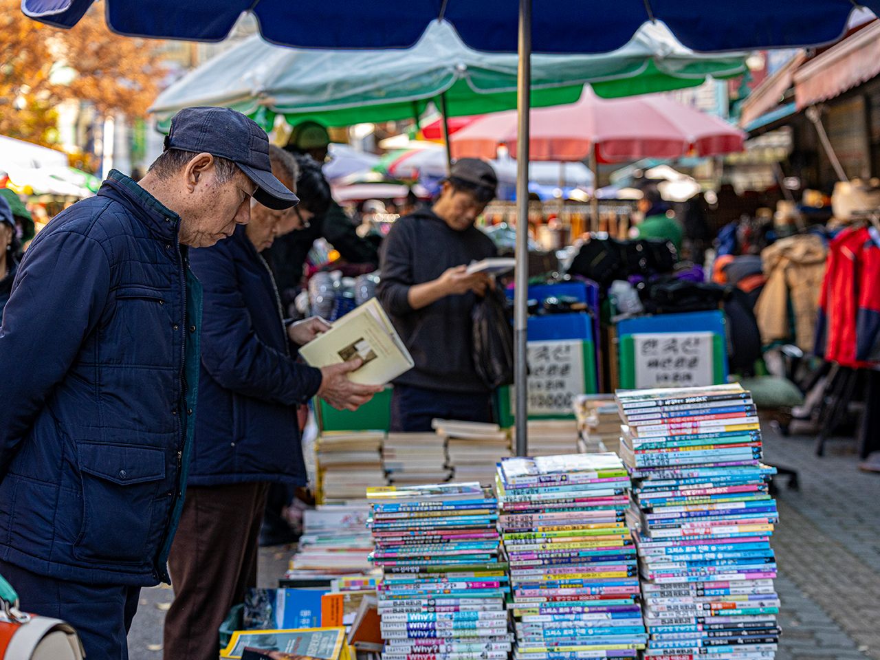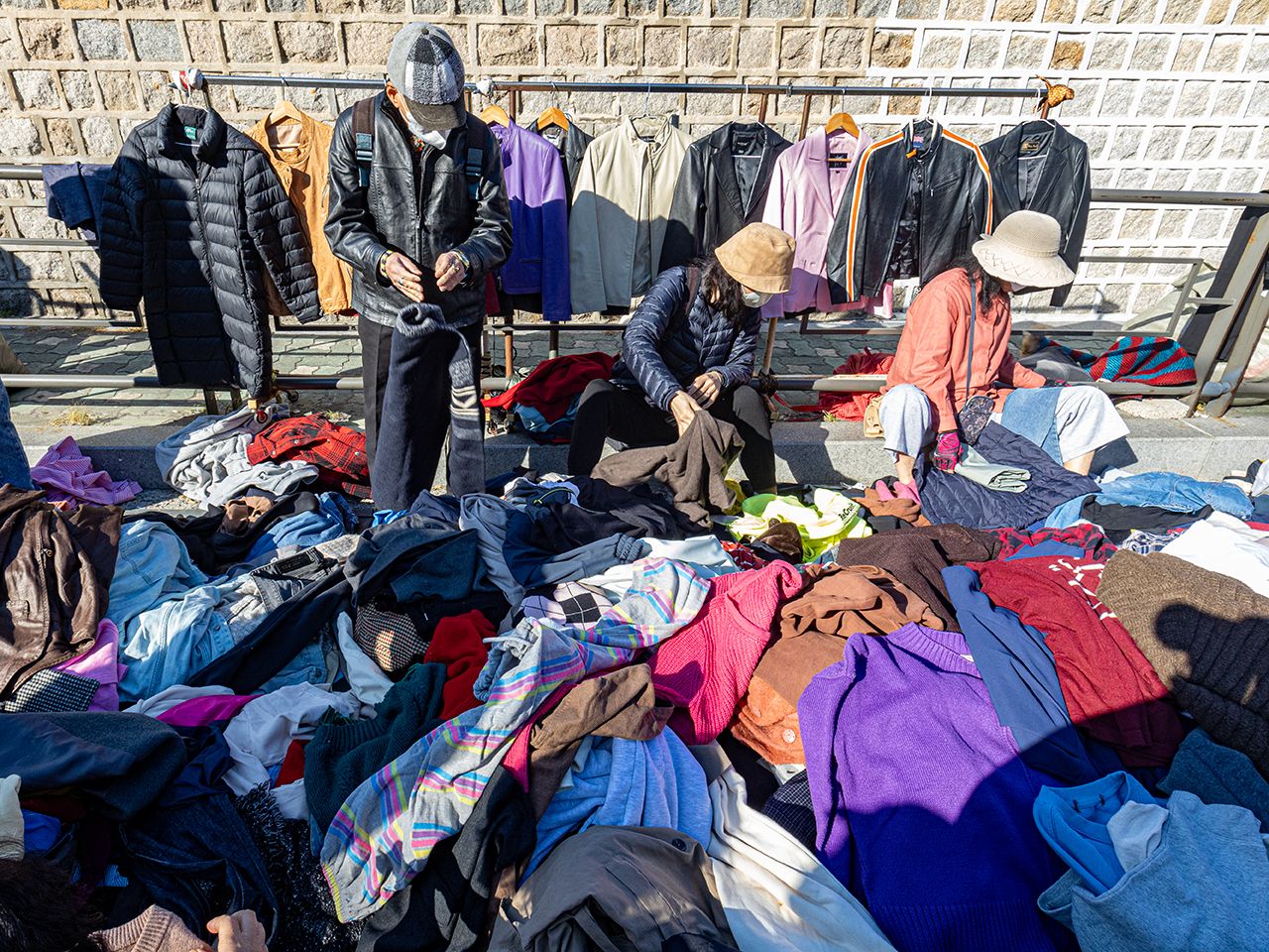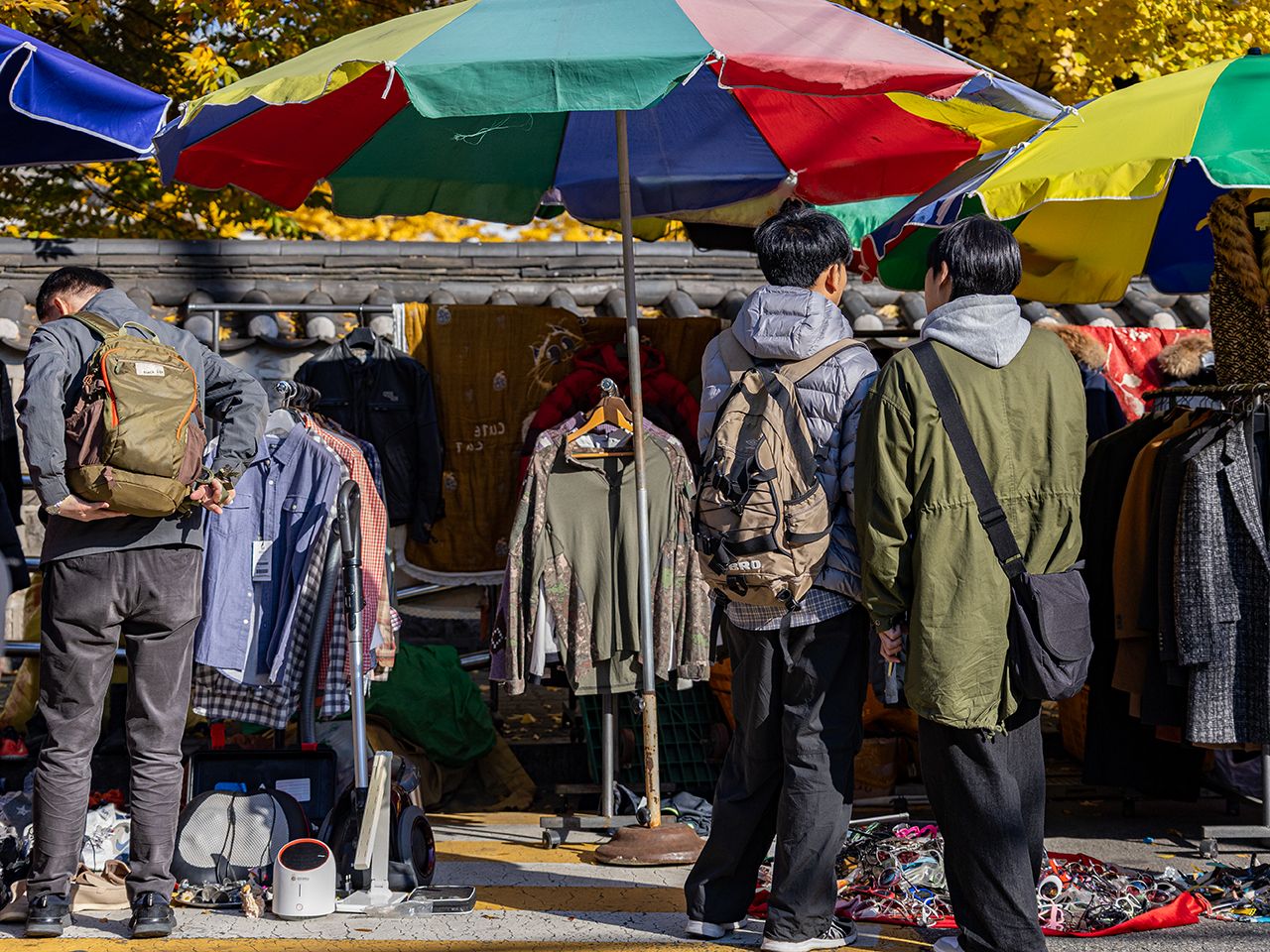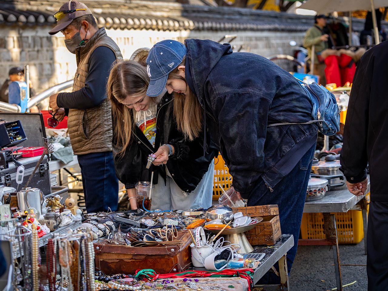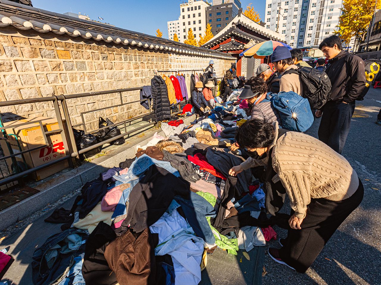 人気観光エリア・東大門(トンデムン)から地下鉄で1駅隣にある東廟前(トンミョアッ)駅は、名前の通り「東廟(トンミョ)」という、中国の三国志に登場する名将・関羽を祭った堂を中心に下町が構成されています。「東廟」周辺の歩道・道路一帯で蚤の市が開催され、カラフルなテントの下で、陽気なトロット(韓国演歌)音楽をバックに、おじさん達で大賑わい。フリーマーケットというよりも、ガラクタ市という雰囲気で、おじさんたちが持ってきた古着や時計、靴、電子機器、アクセサリーや家具・食器など観光地のお店ではあまり見かけられないレアなものがたくさん。意外な掘り出し物に出会えるかもしれませんよ。