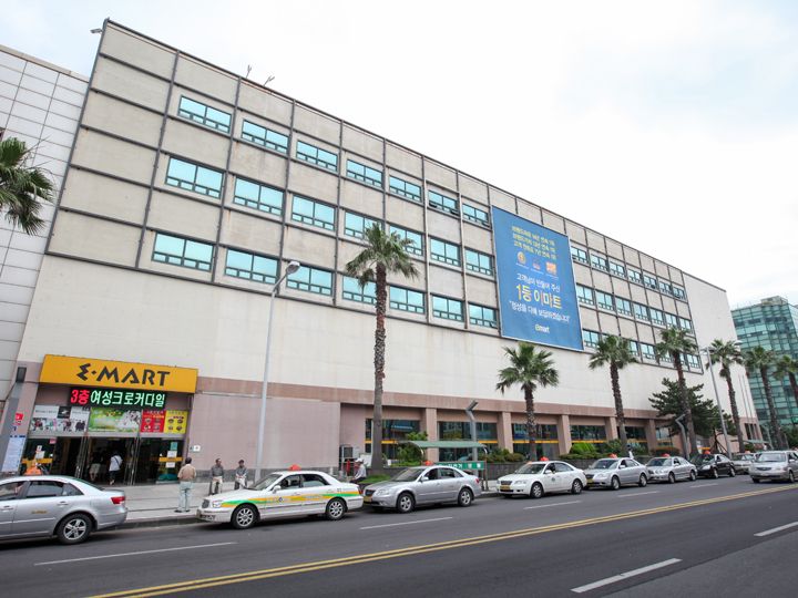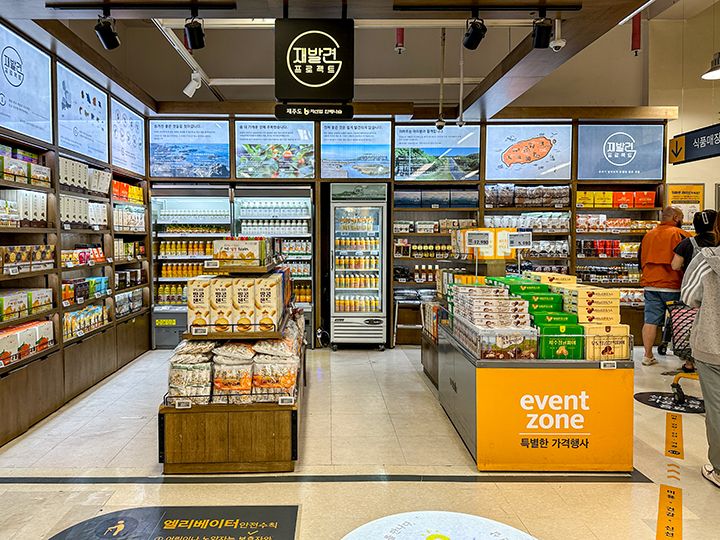 「済州(チェジュ)国際空港」の東側は「旧済州(クチェジュ)」と呼ばれる旧市街地エリアです。このエリアの北側の海浜道路に大型マート「イーマート」があって、旧済州のホテルに宿泊する観光客の韓国土産・済州土産の購入に便利です。売り場は地下1階から2階まで3フロアに分かれていますが、観光客の利用に良いキムチや韓国海苔、お菓子、インスタントラーメンなどの食品コーナーは地下1階にあります。また「再発見(チェパルギョン)」という済州島の特産品コーナーは1階のエスカレーター付近にあり、済州のミカンやピーナッツなどをつかったお菓子、ドリンクなどが買えます。
