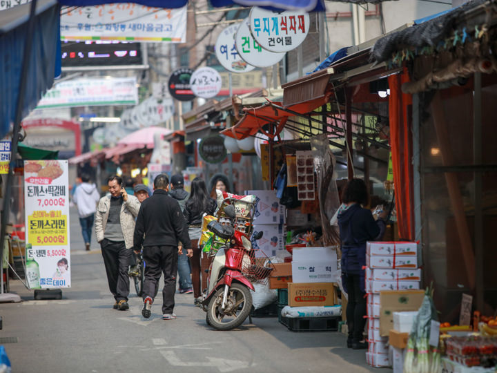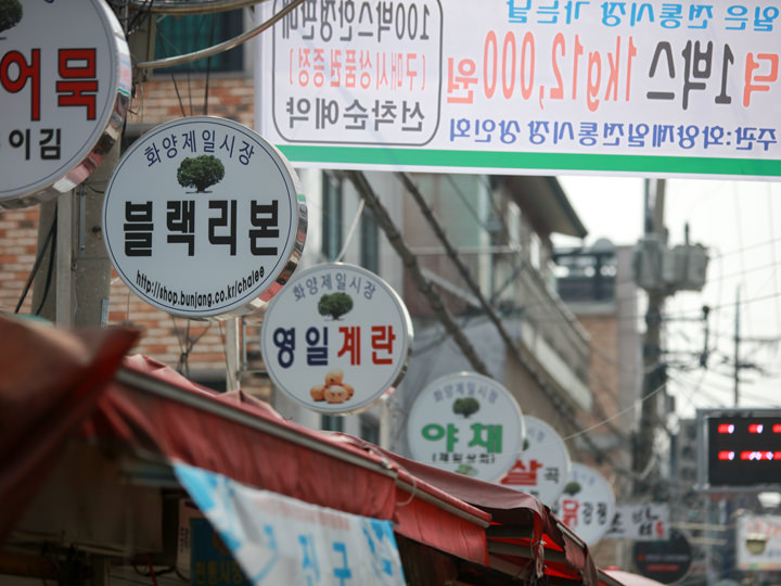 韓国ソウルの東部、語学堂(オハッタン)もあって留学生が多く暮らす「建国大学校(コングッテハッキョ)」の周辺は学生御用達の居酒屋・飲食店が集まっているエリアです。奥へ少し進むと下宿(ハスッ)やコシウォンが集まる閑静な住宅街が広がっていますが、その一角に「市場」と呼ぶには規模がたいへん小さすぎますが、地元の住民・大学生・留学生たちがよく利用する通りがあり、地名から名前を取って「華陽(ファヤン)第一市場」と呼ばれています。日用品店や、自炊用にと八百屋やお惣菜屋が並んでいるほか、食べ歩きにちょうど良いタッカンジョンやトッポッキ店などもあり、地元の人たちにお馴染みの路地市場となっています。