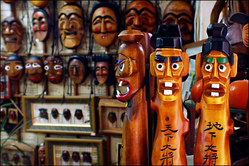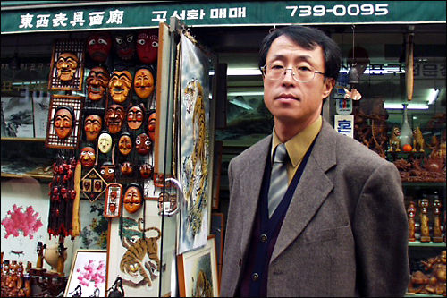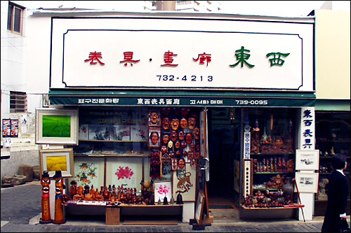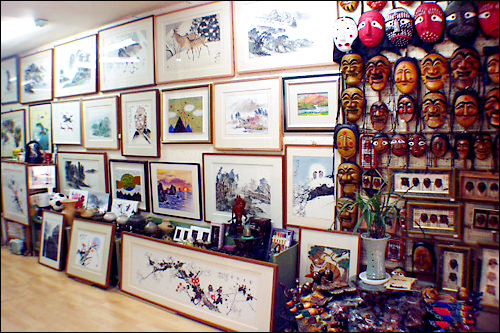 韓国の工芸品店が立ち並ぶ仁寺洞(インサドン)にある「東西表具画廊(トンソピョグファラン)」。地下鉄3号線安国(アングッ)駅から仁寺洞のメインストリートに入りすぐの場所にあり、1977年に創業しました。もともと表具や掛け軸を専門に扱っていましたが、近年は韓国伝統のお面(タル)と木彫りの工芸品も多数取り扱うようになりました。表具は四季を描いたものや虎の掛け軸、松や鶴の絵が入った正月用など季節に合わせたものがあります。日本よりもずっと安いため、日本人のお客さんがよく訪れるといいます。