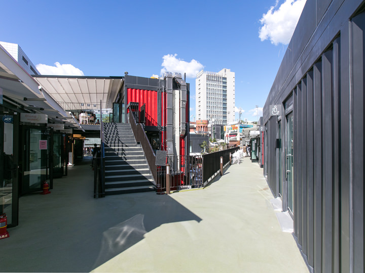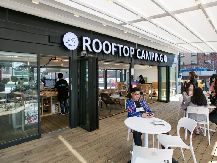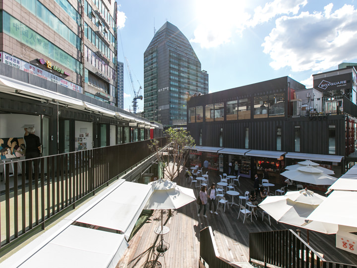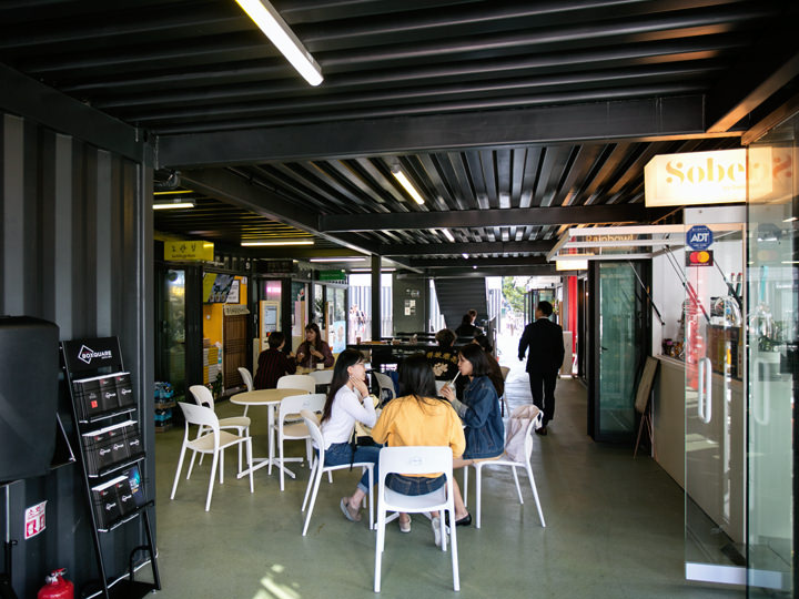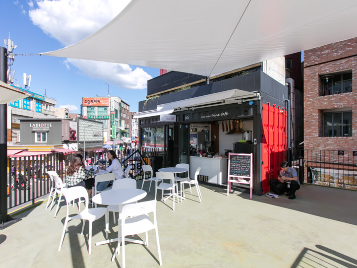 プチプラショッピングが楽しめる梨大(イデ)とソウルきっての学生街・新村(シンチョン)。その間に位置する京義・中央(キョンイ・チュンアン)線の新村駅(韓国での通称「新村汽車(シンチョンキチャ)駅」)の目の前に、新しい文化空間「BOXQUARE」が2018年9月にオープンしました。黒いコンテナーを利用した建物は、3階建てで、中央の吹き抜けスペースを囲うように露店式のお店が並びます。グルメ店はもちろん、セレクトグッズのショップなど50以上のお店が入店し、中には若いオーナー運営のセンス溢れるショップも豊富です。いたるところにテーブルとイスが設置してあるので、外の景色を楽しみながらゆっくりとお茶や食事を味わえるので、休憩スペースとしても最適です。