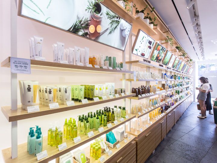 「innisfree(イニスフリー)」は韓国の大手化粧品会社「AMORE PACIFIC(アモーレパシフィック)」から生まれたコスメブランド。有機緑茶や各種ハーブのエッセンスを配合し、肌にやさしいのが特徴です。女性用のスキンケア製品やメイクアップ用品はもちろん、ベビー&メンズラインなど、幅広いアイテムが充実。メインとなる女性用スキンケア製品は、しわ・美白といったアンチエイジングライン、艶やかな素肌を目指す美肌ライン、年代を問わず人気の保湿ラインなど、肌の特徴や悩みに応じて選べる豊富なラインナップを用意。全国各地に支店があるなか、繁華街・明洞(ミョンドン)の明洞駅近くにあるショップが「明洞忠武(ミョンドン・チュンム)店」です。