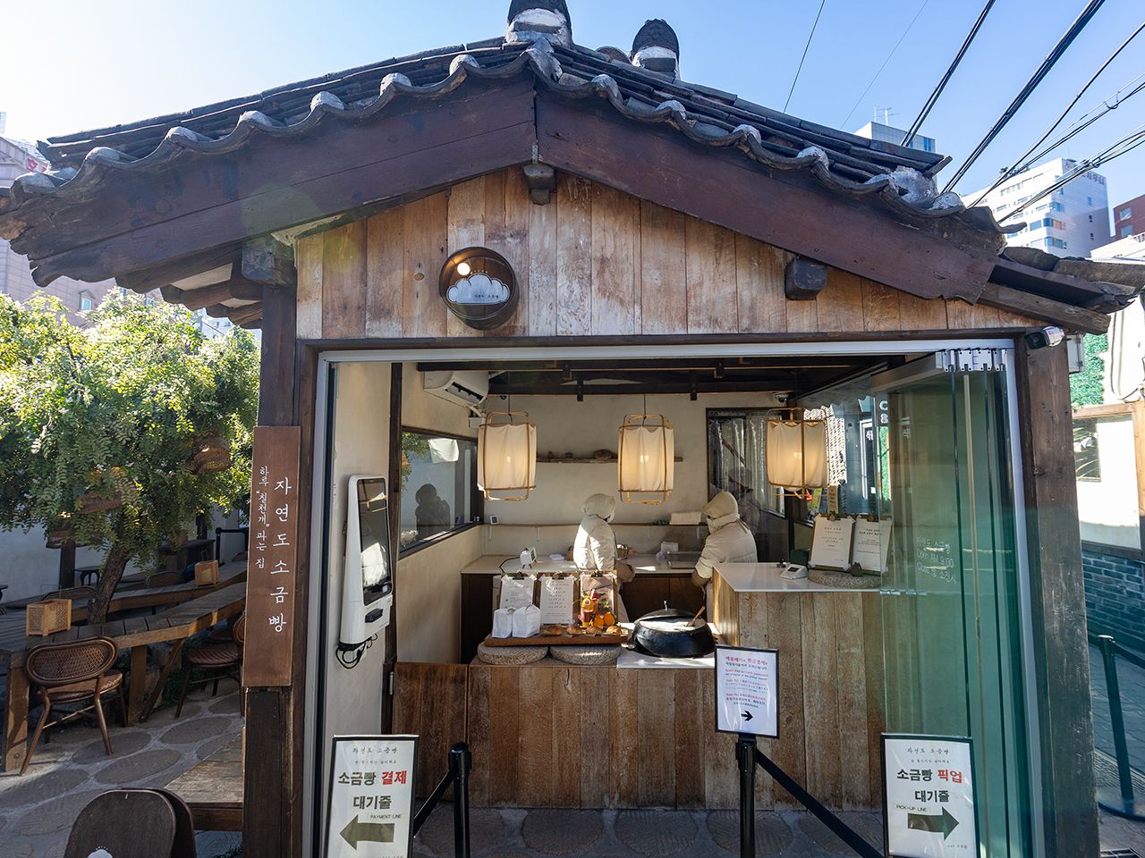 各地に店舗を展開し、ソウルの「益善洞(イクソンドン)韓屋村」にも店舗があります。カード決済専用タッチパネルで購入して交換券を発行したら、受け取りの列に並んでピックアップを待ちます。すぐ隣に屋外イートインスペースがあり、出来立てホヤホヤの塩パンがすぐに食べられます。