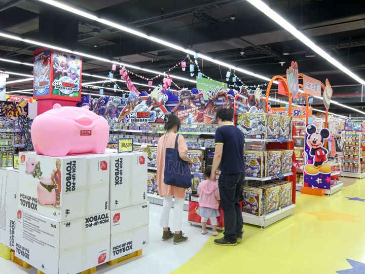 韓国で初めて、子どもに特化した売り場を備えた大型スーパーが「ロッテキッズマート 釜山(プサン)店」。4階建ての店舗の3・4階部分がキッズ関連フロアです。子どもの生活用品や衣類が揃うだけでなく、玩具の「トイザラス」やキッズカフェ、小児科まであります。1・2階は従来の「ロッテマート」と同様に食料品と生活用品が購入できるフロアになっており、各階にはフォトゾーンや休憩スペースがつくられています。ショッピング中心街の西面(ソミョン)からタクシーで3分ほどで、無料駐車場もあります。