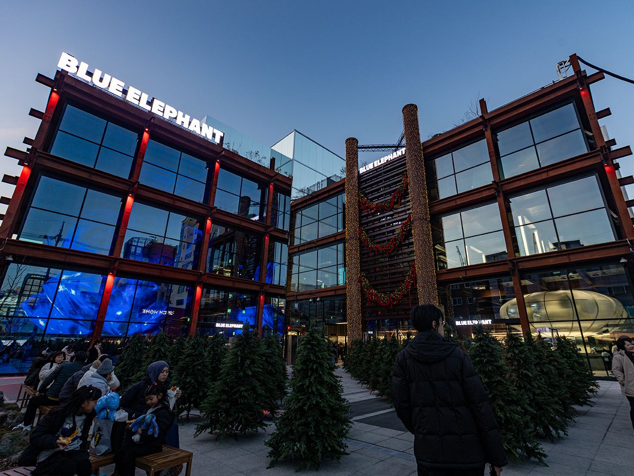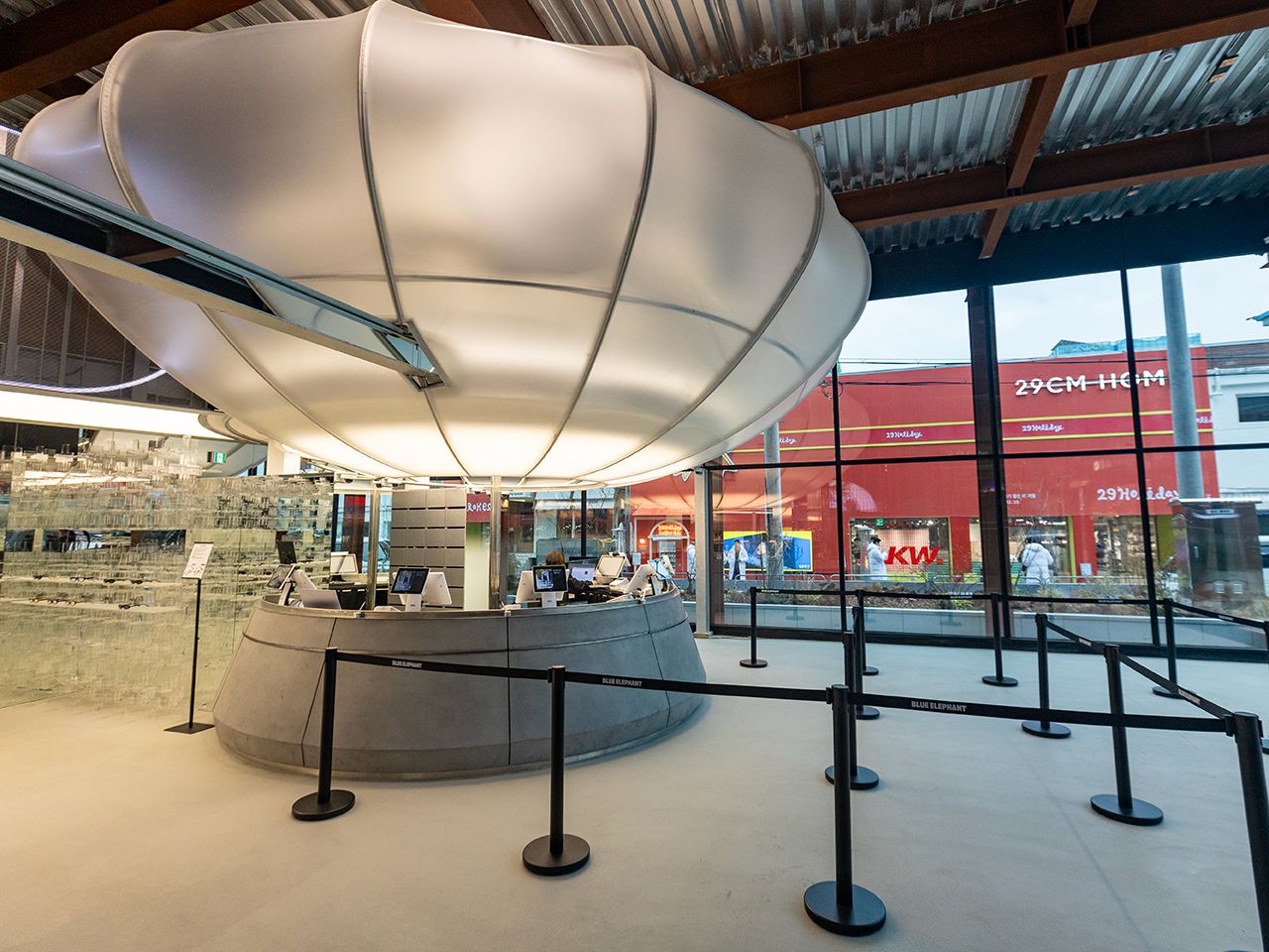 右側の入口からはサングラス売り場へ、左側の入口からは3階のカフェ、4階の屋上へと導線が分かれており、ショッピングと空間体験を明確に切り分けている点も特徴です。プロダクト、価格設定、空間演出まで一貫した世界観を持ち、聖水洞らしい「体験型フラッグシップストア」として注目。夜に訪問すれば夜景も見事、まさに宇宙船のような建物です。
