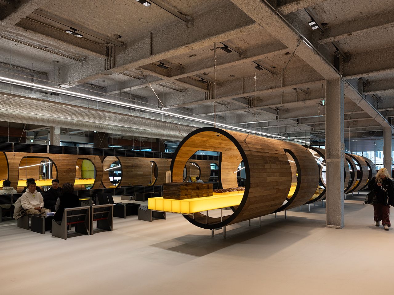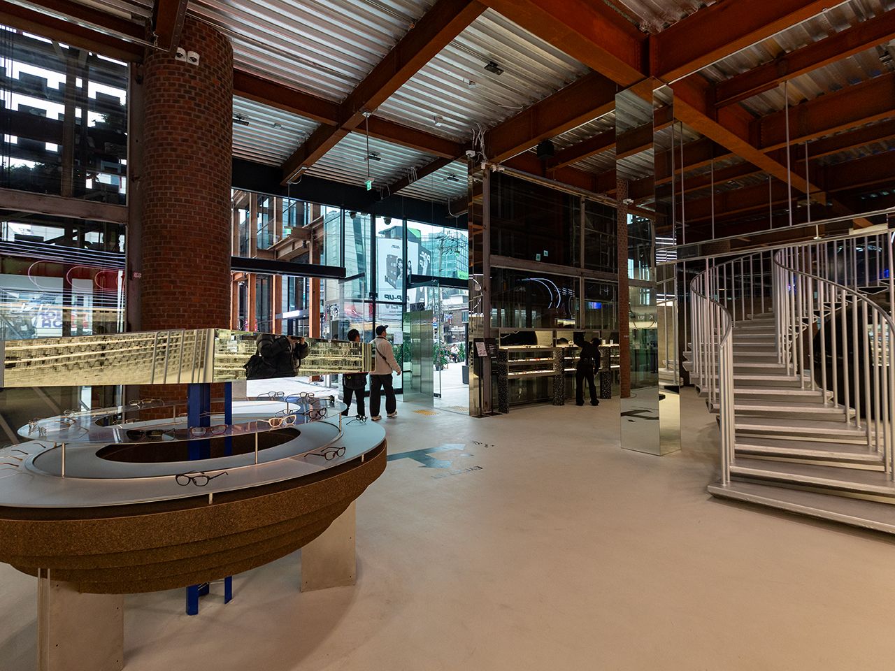 2025年にソウル・聖水洞(ソンスドン)のメインストリート沿いに4階建ての大型店がオープン。宇宙船を思わせる近未来的なコンセプトで統一され、無機質な素材感、曲線を多用した構造、計算された照明演出は、まるでスペースシップに足を踏み入れたかのようです。サングラスが並ぶ空間は、プロダクトが宙に浮かんでいるように見える立体的なディスプレイ構成で、一本一本の存在感を際立たせる設計。単なる物販ではなく「見る・選ぶ」という体験そのものをデザインに昇華しています。