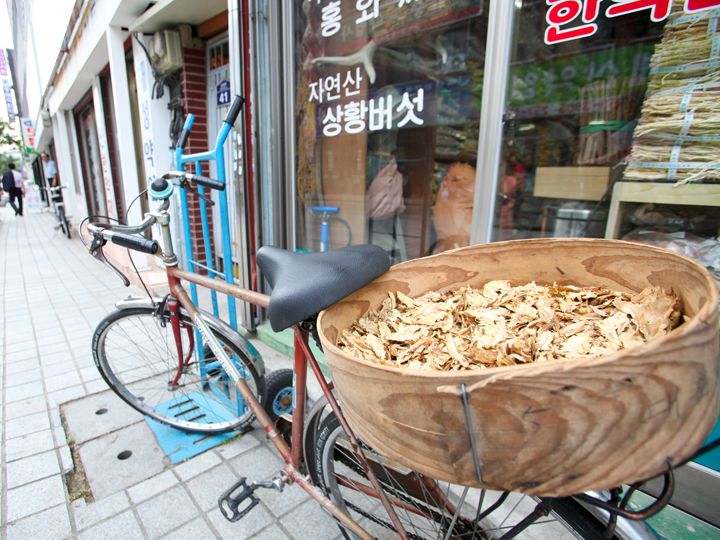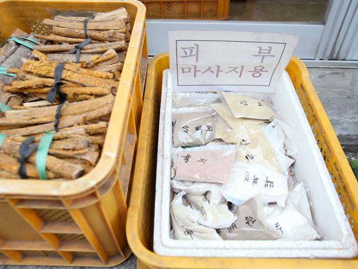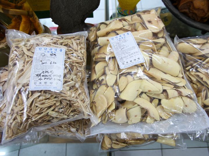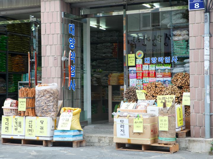 歴ある韓方市場で通りには韓方薬局や韓方薬材店が並んでます。
