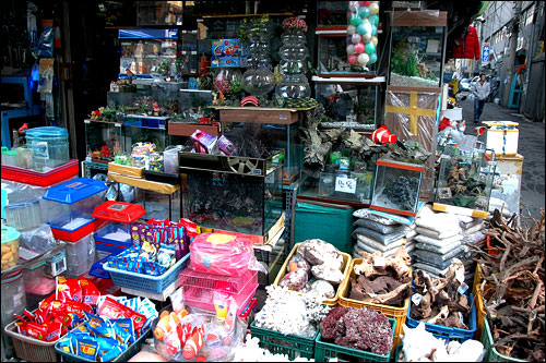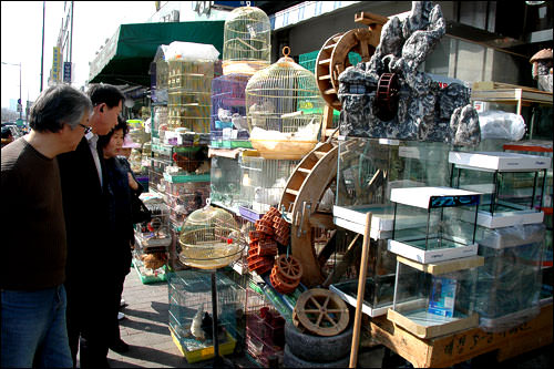 ソウル市内東部の東大門(トンデムン)市場の片隅に、犬やハムスター、ウサギ、鳥、観賞魚、昆虫などペットの卸売市場があるのが東大門ペットショップ通り(ペット卸売市場)。清渓川(チョンゲチョン)のほとりのビルの1階を中心に約40店があり、まるで水族館か鳥類動物園のような雰囲気。犬や猫は「忠武路愛犬通り」で多く売られていますが、ここではもっと多くの種類が取り扱われています。ペット用品、ペット服、エサなどの飼育用品もかなりの種類が揃っています。生き物を日本に持って帰るには各種の制限がありますが、ぶらぶら歩くだけでも楽しめる市場です。