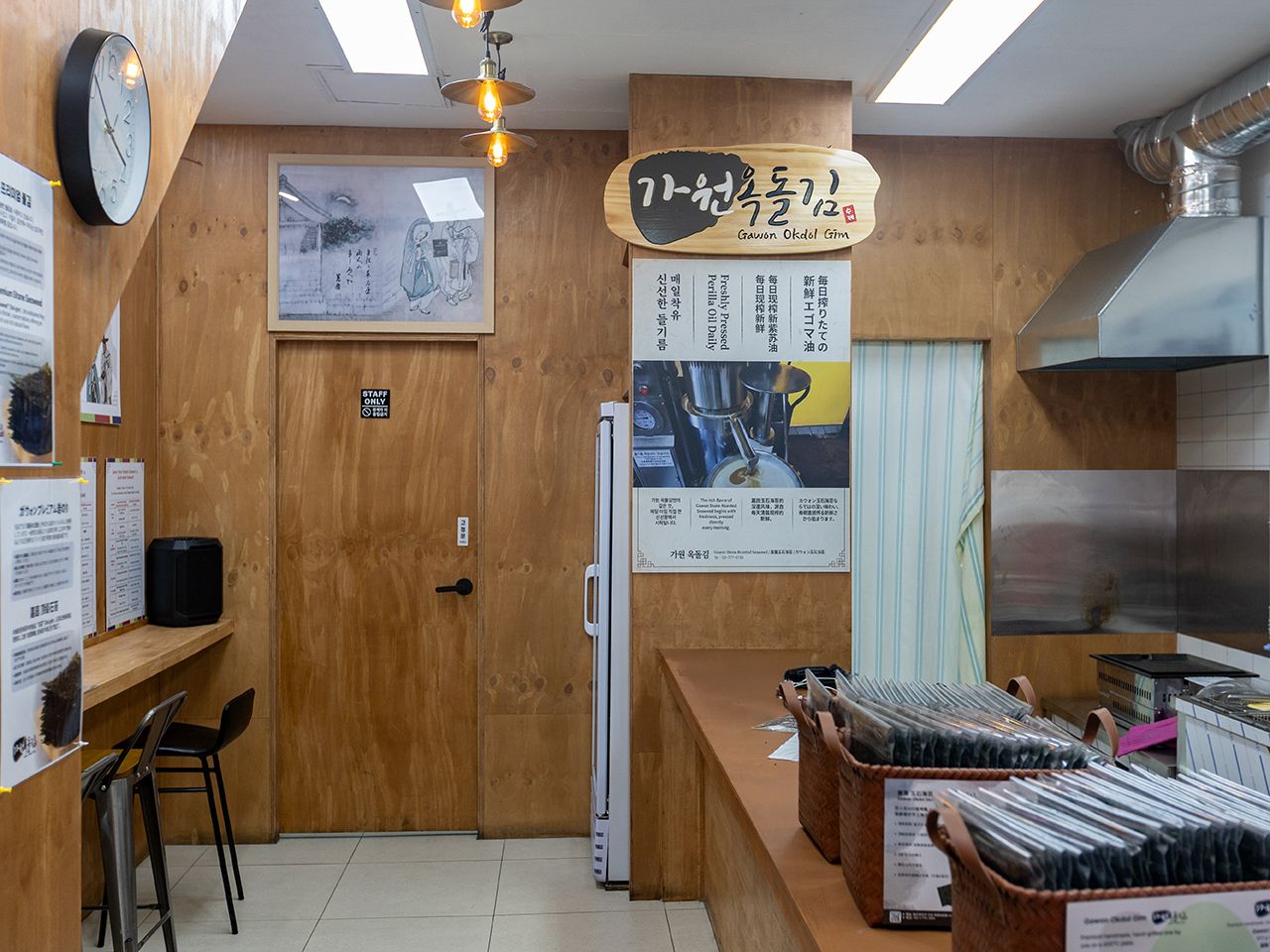 店内に入ると、ごま油とエゴマ油をまとった海苔の香ばしい香りが漂ってきます。