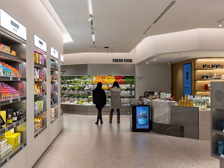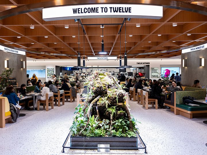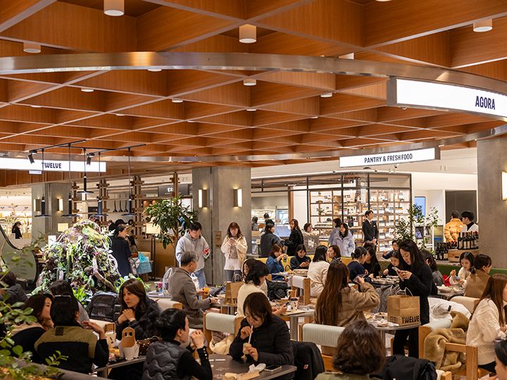 地下1階全体を「TWELVE(トゥウェルブ)」と名付け、高級スーパー路線を引き継ぎつつ、デリコーナーやソウルで話題の店舗が続々と入店し、ワンランク上のライフスタイル提案を行っています。地下フロアの中央には約100席を誇る広々としたイートインスペースを完備。購入した商品をすぐに味わえる中庭ラウンジとして、ゆったりと長く滞在できるような作りにしました。