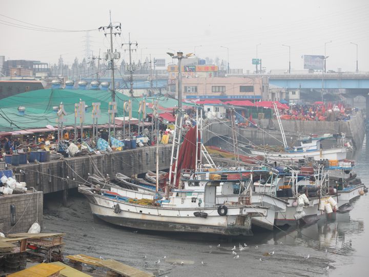 蘇莱浦水産物市場(セリ場なので観光客は×)の周りを囲む在来市場で、河口の砂浜に船がドーンと乗り上げて魚を下す光景が迫力満点!